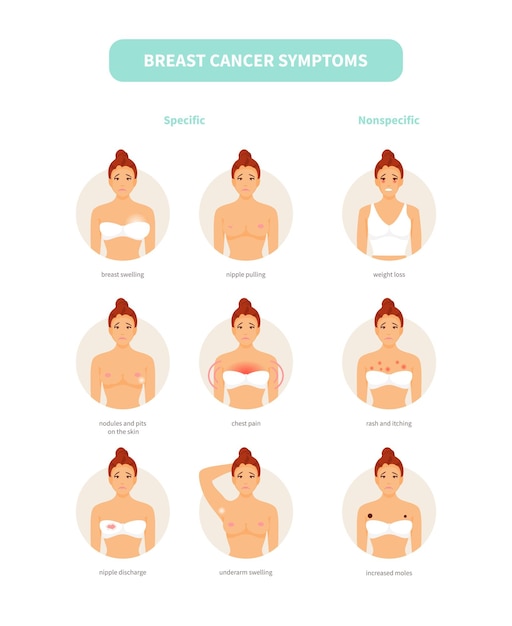 Rak piersi może manifestować się na wiele różnych sposobów. Najczęściej można zauważyć takie objawy jak: